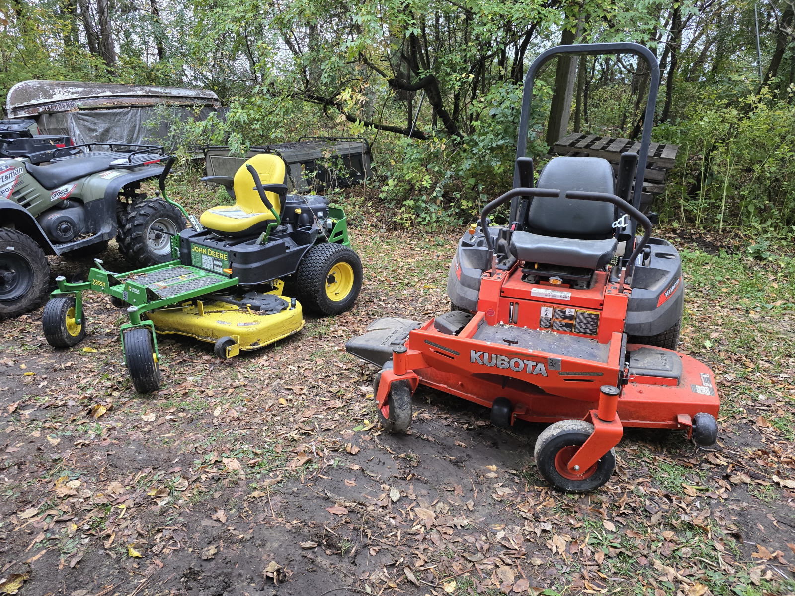 Mowers: JD Z365R Z Turn Mower 40” Deck, 39.2 Hours; Kubota Commander ZG127S 54” Deck Z Turn, 31.5 Hours; Cub Cadet Z Force Z Turn