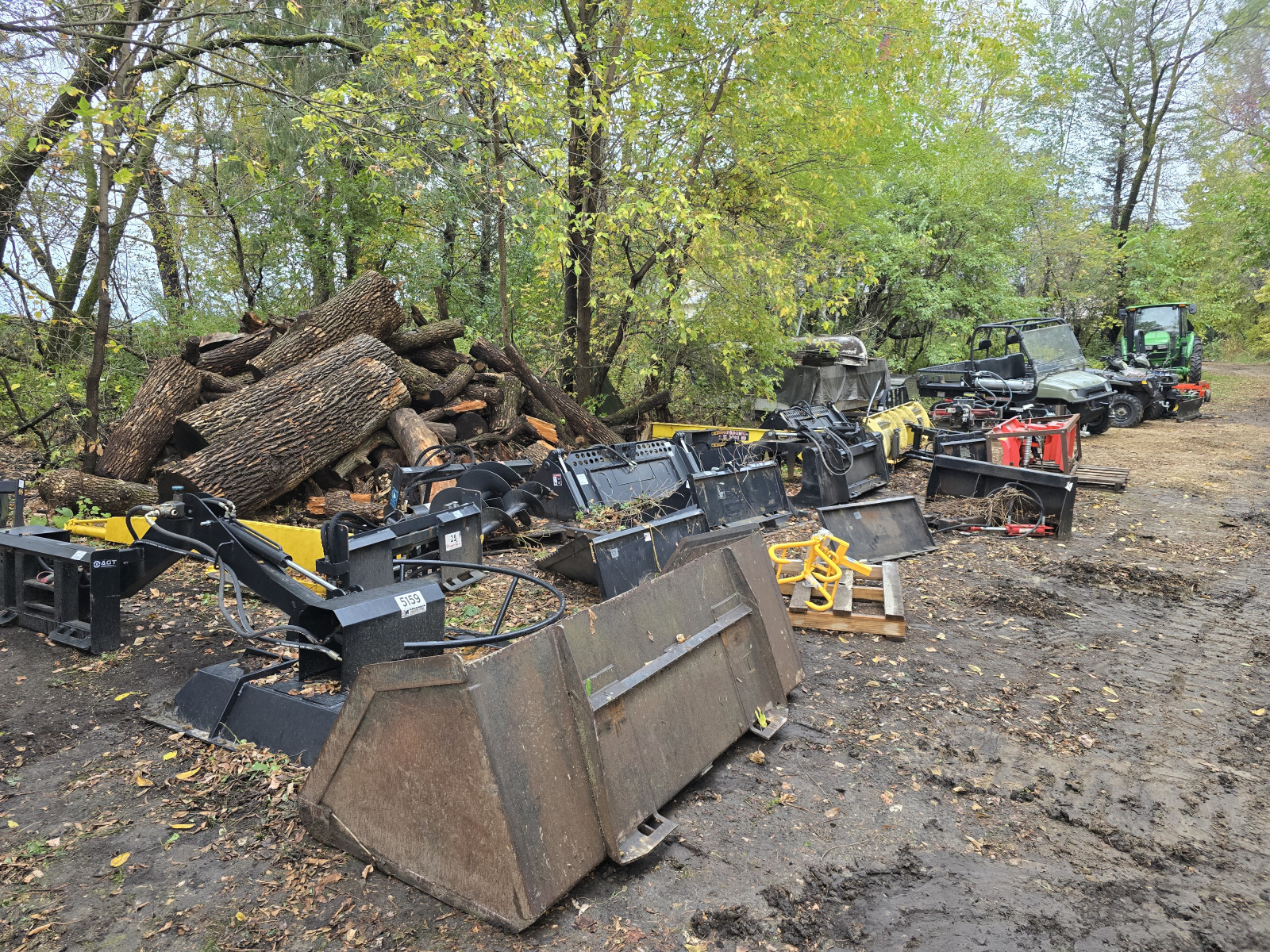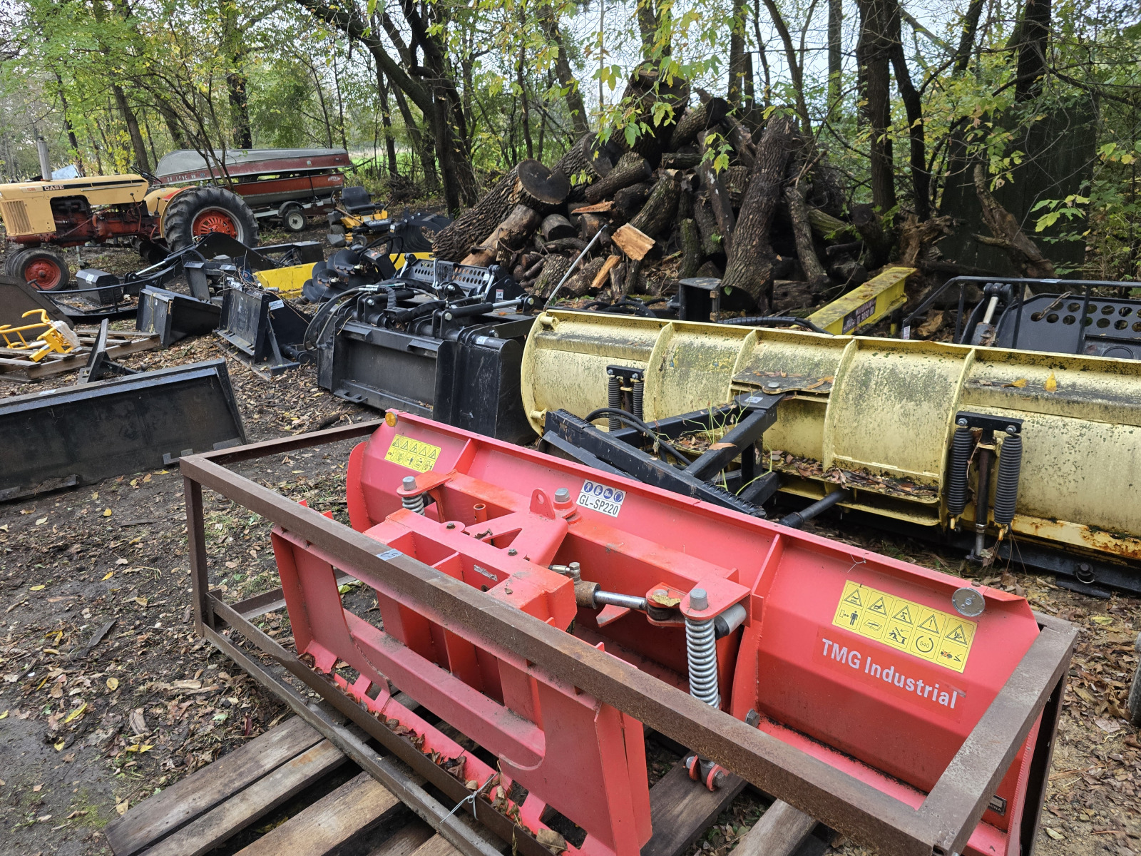 Puller; Tomahawk Pallet Forks; 9’ Skid Steer Blade; 7’ TMG Industrial Skid Steer Blade; Hyd Forks; Skid Steer Plate; 6’ Pallet Fork Extensions; 3-point, 2 Bottom Plow