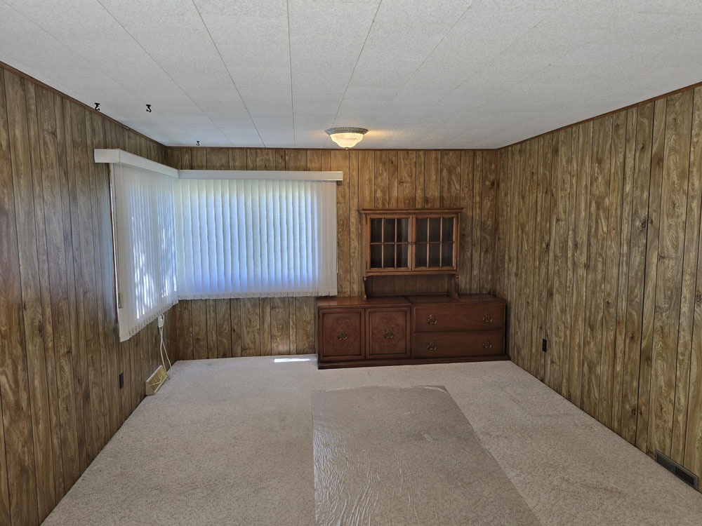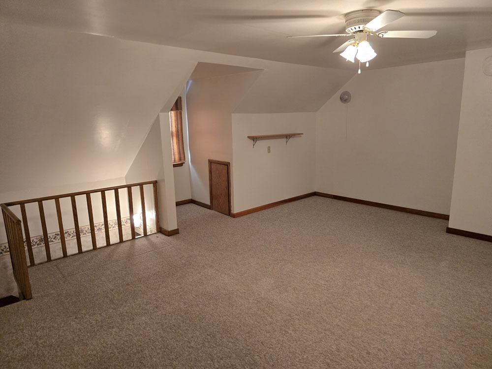 Upper Level: Rec/family room with carpet floors and ceiling fan. 1 bedroom with carpet floors and walk in closet. 1/2 bath.