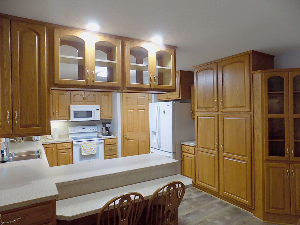 Main Level: Kitchen with center island, large walk in pantry, and under-cabinet lighting. Dining room open to kitchen and living room, with patio door to deck. Living room with built-in corner entertainment center, brick-faced, gas fireplace, and front entrance to home with coat closet. Primary bedroom with ensuite 3/4 bath, and walk in closet. 2 additional and full main bath with linen closets and shelves. Laundry room with deep sink in corner, wall hangers, and cupboard space.