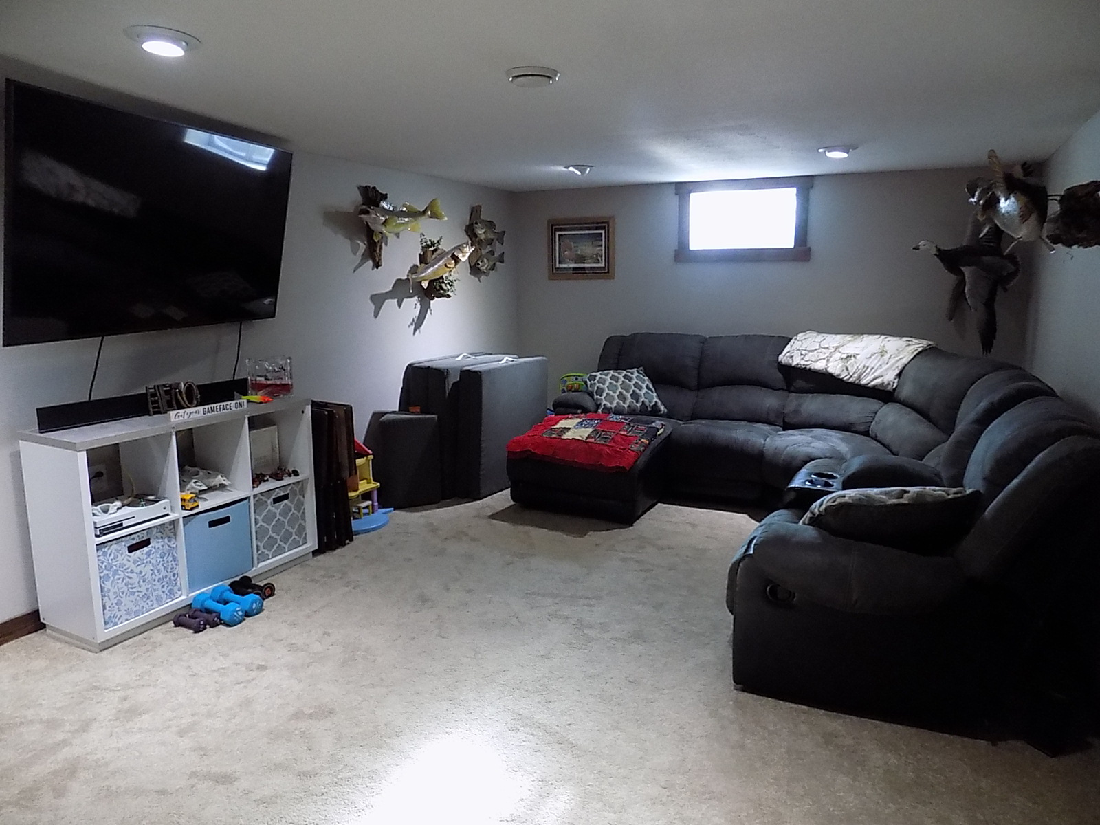 Basement: Family room with carpet and wood look plank floor, 1/2 bath in with