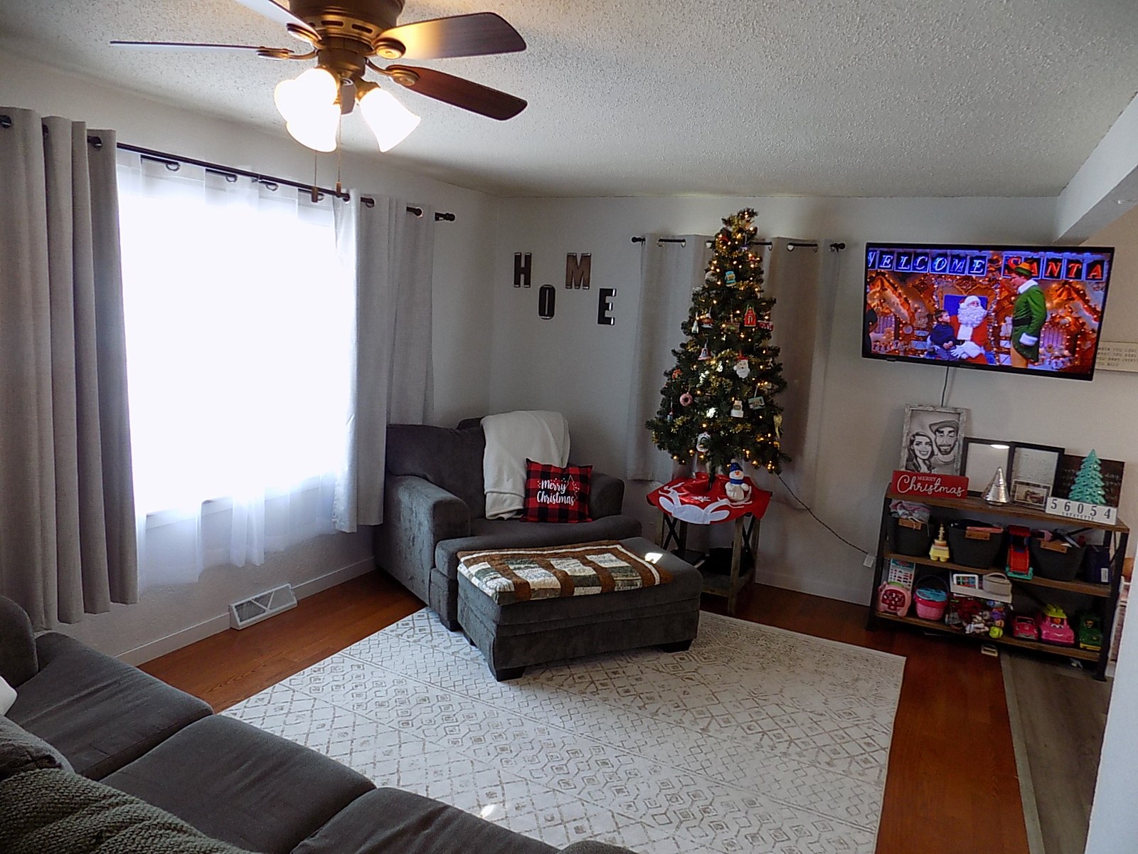 room with ceiling fan and laminate floors, front door entry & coat closet,